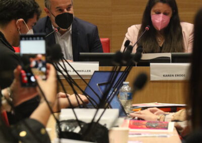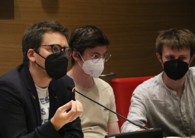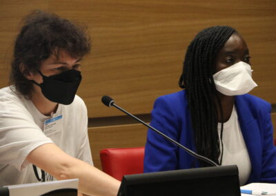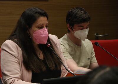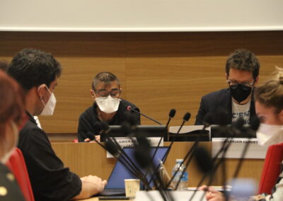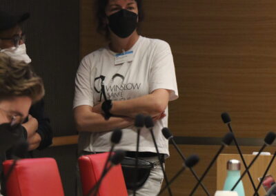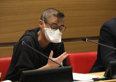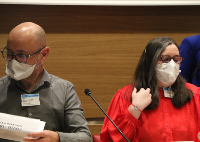 Durant toute la matinée, une quarantaine de participantEs étaient présentEs en continu : députéEs, représentantEs d’associations de lutte contre le COVID Long, personnes vivant avec le COVID Long, personnes handicapées et/ou malades chroniques, personnes aidantes… Toutes les personnes présentes portaient un masque FFP2. La qualité de l’air dans la salle était excellente (entre 500 et 800 ppm tout du long).