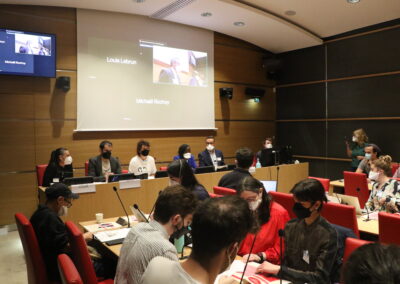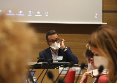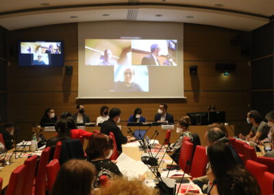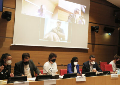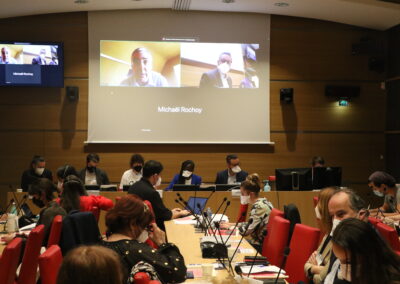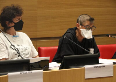 Le colloque s’est déroulé mercredi 11 juin de 9h à 13h00 dans une grande salle de l’Assemblée Nationale en sous-sol. À l’entrée de cette salle, une petite table présentait différents flyers d’information sur le COVID Long et l’autodéfense sanitaire. Des bénévoles de Winslow Santé Publique accueillaient les participantEs avant le démarrage de l’événement pour leur distribuer des masques et les flyers d’information. Dans la salle, une table surélevée accueillait les intervenantEs en présentiel. Au-dessus de cette table se trouvait un écran pour projeter les visioconférences des intervenantEs présentEs en distanciel.
